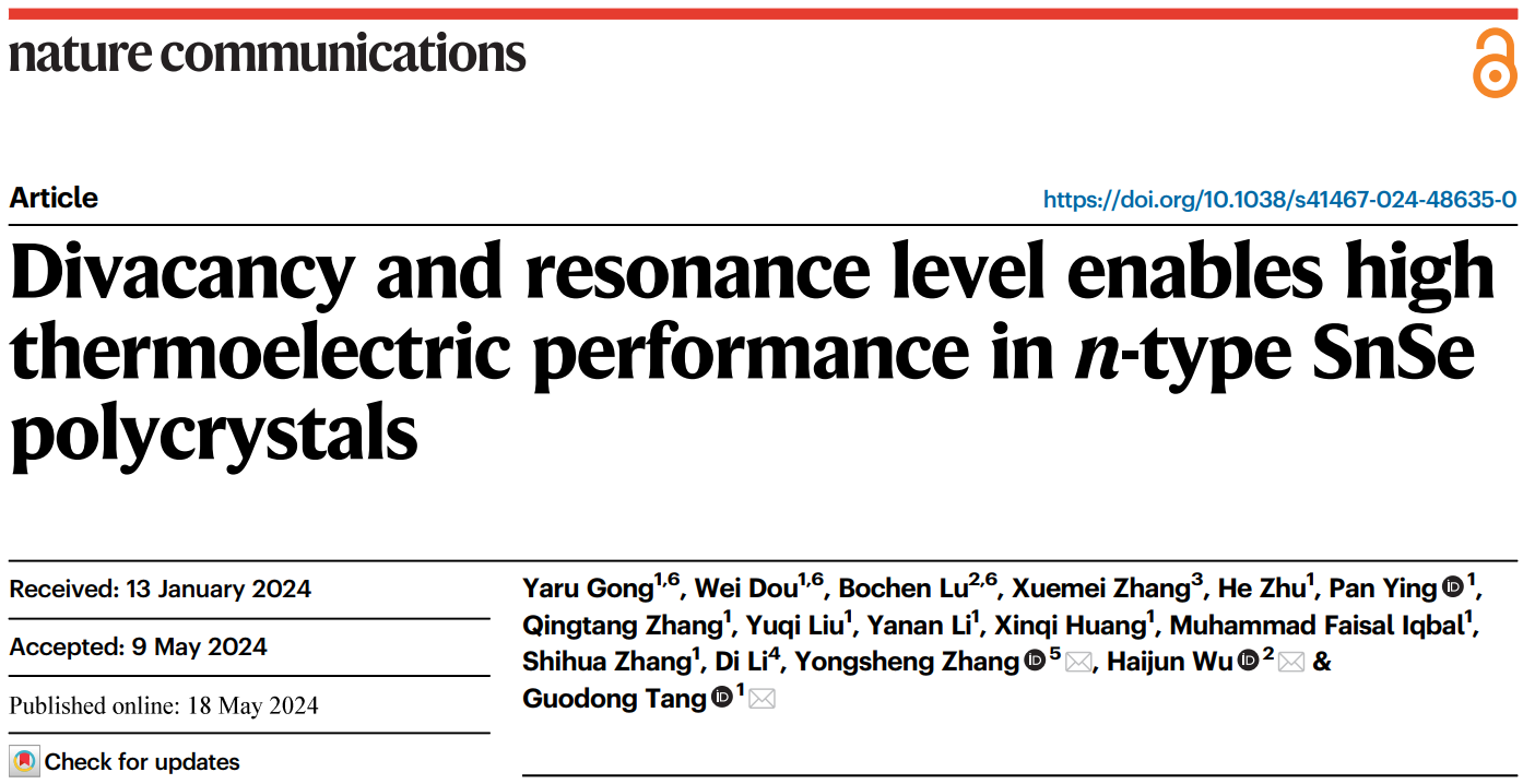 该研究成果以《双空位和共振能级优化n型SnSe多晶体热电性能》(“Divacancy and Resonance Level Enables High Thermoelectric Performance in n-Type SnSe Polycrystals”)为题发表于《自然·通讯》(Nature Communications 2024, 15, 4231)。武海军教授、曲阜师范大学张永胜教授和南京理工大学唐国栋教授为共同通讯作者,8X8X