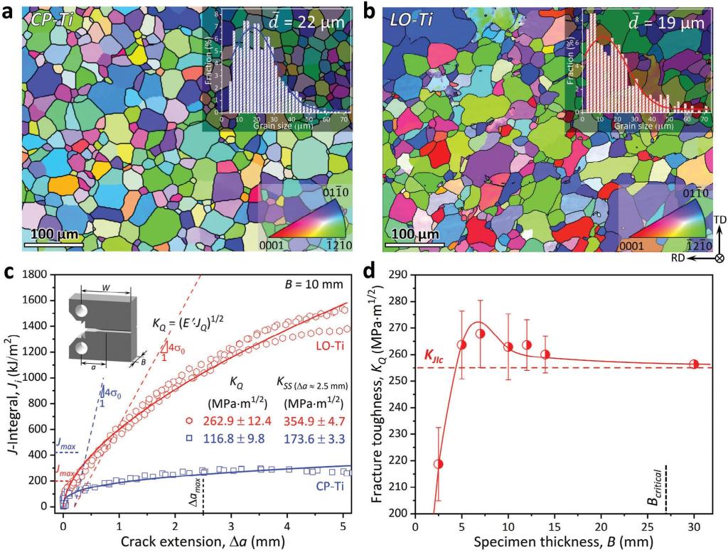 图1 商业纯钛和低氧钛的初始结构与断裂韧性测试。通过对厚度为2.5 mm至30 mm的低氧钛样品开展标准CT样断裂韧性测试,发现其满足平面应变条件的断裂韧性值(KJIc)达到255 MPa∙m1/2。