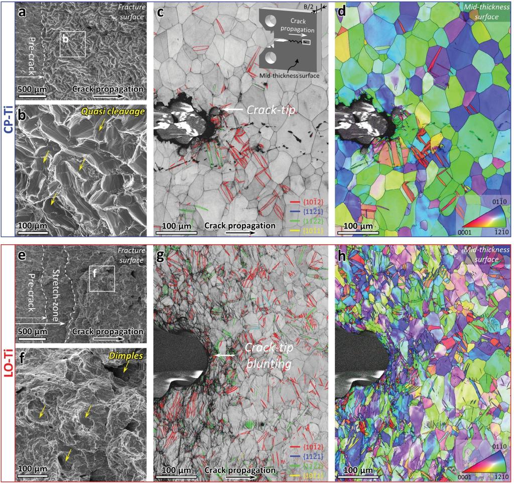 图3 低氧钛裂纹尖端大量变形孪晶被激活,形成了从裂纹尖端到基体的梯度渐变组织,裂纹尖端的晶粒尺寸被显著细化,而商业纯钛的裂纹尖端仅有少量的变形孪晶。