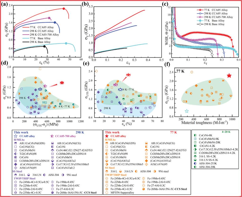 图2. 设计的Fe35Co29Ni24Al10Ta2合金与目前报道的高性能合金在室温/低温下的性能对比