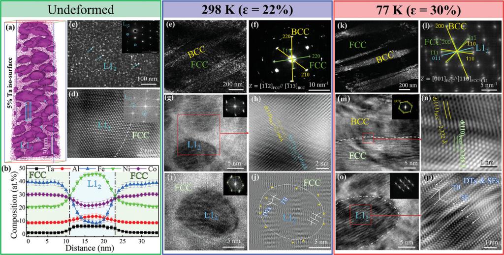 图1. Fe35Co29Ni24Al10Ta2合金的初始态、室温变形和低温变形微观结构