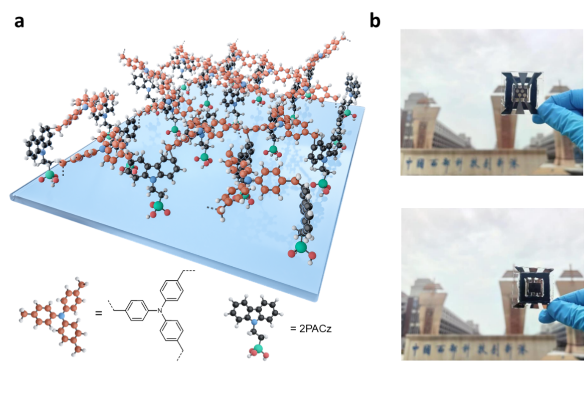 随着全球可再生能源需求的迅速增长,太阳能光伏技术已成为应对能源危机与环境污染的关键解决方案。其中,钙钛矿太阳能电池因其具有高光电转换效率、低材料成本及轻质结构等优势,在太阳能光伏领域备受瞩目。反式钙钛矿太阳能电池,相较于传统的正式结构,加工工艺简单、易于实现相对低温制备、且耐候性更佳,因此受到学术及产业化的广泛关注。近年来,通过界面工程等策略优化,反式钙钛矿太阳能电池的效率已突破26%。然而,现有界面自组装单分子层(SAM)主要通过化学方式吸附在透明导电层(TCO)表面,当器件暴露于高温或经历热循环冲击时,分子层可能发生脱附或聚集,导致界面接触恶化及载流子(空穴)传输受阻,最终显著削弱器件的性能和稳定性。因而,开发更为稳定和高效的空穴选择性接触新材料体系对于进一步提升器件的热稳定性,推动其产业化应用至关重要。