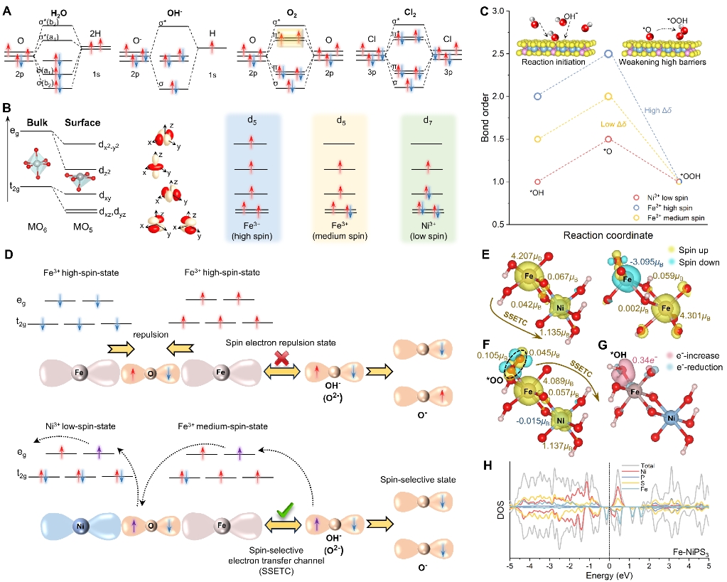 科研人员提出了通过非对称Fe-Ni立构策略以实现原子级局域自旋调控的新机制。将Fe引入NiPS3晶格后引起自旋态重新分布,形成具有中自旋态(MS)的Fe3+活性位点。通过P/S配位进一步稳定Fe3+的MS态,并凭借自牺牲抑制竞争性的Cl⁻氧化反应及Cl⁻毒化。该催化剂在碱性及真实海水电解中均展现出优异性能,在10 mA cm⁻2条件下的工作电压仅为1.50 V/1.52 V,并能保持1000小时稳定运行。此外,该催化剂在阴离子交换膜(海)水电解槽(AEM(S)WE)器件中也表现出稳定低压的工作优势。此外,通过理论计算、X射线吸收谱、电子顺磁共振、穆斯堡尔谱等多维度技术手段,系统地揭示了MS Fe3+在促进自旋选择性电子转移中的关键作用。本研究为非贵金属催化体系中构建内在自旋调控路径提供了新范式,对绿色高效制氢催化剂设计具有重要参考意义。
