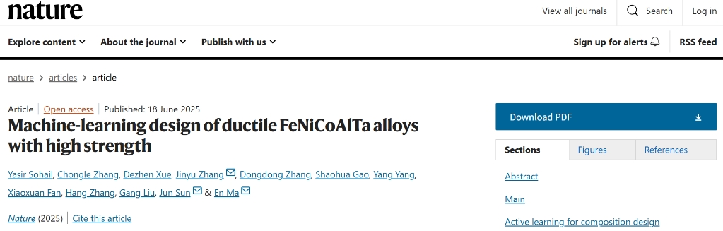 该研究成果以“Machine-learning design of ductile FeNiCoAlTa alloys with high strength”(“机器学习设计具有高强度塑性的合金”)为题在线发表于《Nature》(《自然》)。8X8X