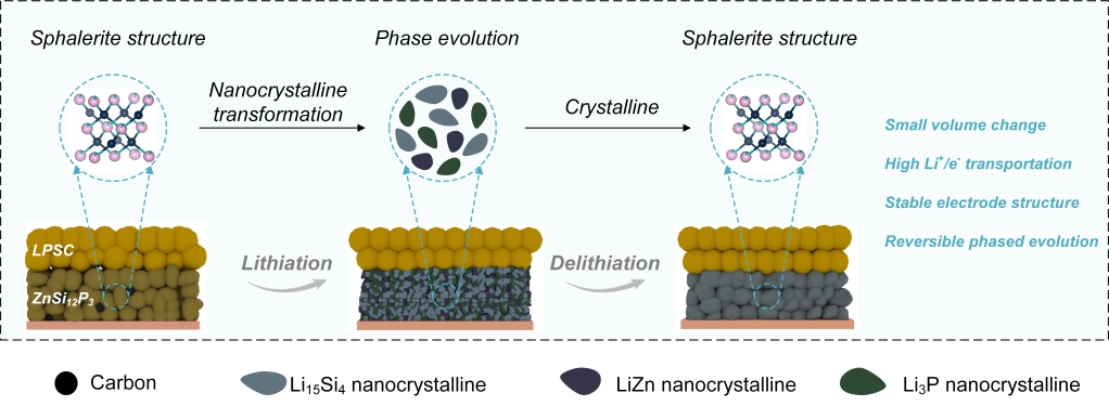 宋江选教授团队提出了一种具有可逆纳米晶相转变特性的低成本、高导电、高稳定性ZnSi12P3新型硅基负极材料。该材料在锂化过程中经电化学驱动可原位转化为Li15Si4、LiZn和Li3P纳米晶相,脱锂后可逆转变回原始的ZnSi12P3结构,从而有效缓解体积膨胀带来的应力并保持电极结构稳定性。该负极材料展现出高达2669 mAh/g的可逆比容量,并在与高镍三元正极匹配后,于3C高倍率条件下实现了超过3000次稳定循环。相关研究成果以《硅基负极中可逆的纳米晶相转变促进了全固态电池的稳定运行》(Reversible Nano Crystalline-Phase Transformation in Si-based Anode Enables Stable All-Solid-State Batteries)为题,发表于国际权威期刊《纳米快报》(Nano Letters)。8X8X