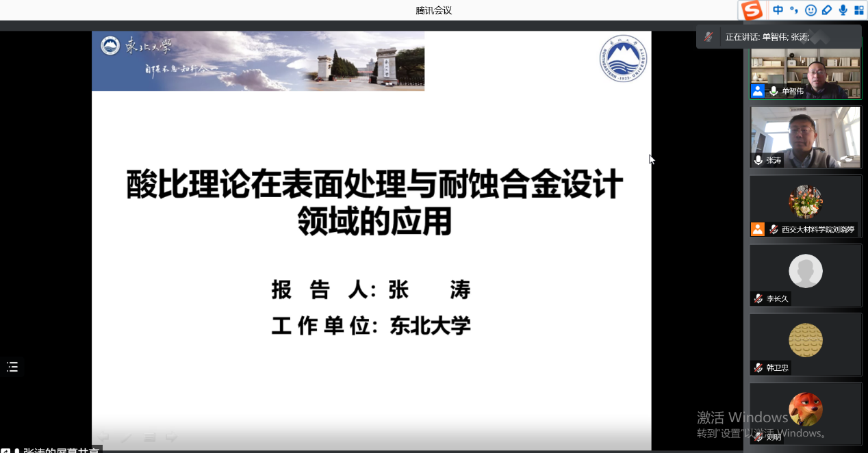 张涛教授首先关心全体交大师生身体状况鼓励大家凝心聚力、共克时艰并做题为《“酸比”理论在表面处理与耐蚀合金设计领域的应用》的学术报告。张涛教授介绍了“酸比”理论,并展开介绍基于该理论产生的包括绿色、高耐蚀镁合金化学转化膜;自致密微弧氧化涂层及低成本、无排放的绿色钢铁酸洗技术等新技术。张涛教授团队以“酸比”理论为指导,在材料表面处理领域获得了很大的成功,解决了转化膜开裂与增厚难以兼顾、微弧氧化涂层孔隙率过高的传统难题,形成系列性的高耐蚀、绿色镁合金表面处理技术;解决了钢铁酸洗成本高昂、污染严重的传统难题,建立了低成本、近零排放的钢铁材料绿色酸洗技术。新型表面处理技术的耐蚀性能大幅度提高并顺利通过环境评估。