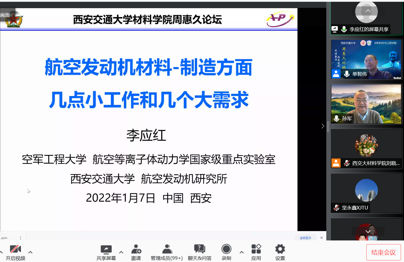 院长单智伟教授邀请,空军工程大学李应红院士做客周惠久论坛线上讲座,他以“航空发动机材料制造方面的几点小工作和几个大需求”为题为大家揭开航空发动机制造的神秘面纱。报告受到广泛关注,来自西安交大及其他高校、科研院所等1770余名师生在线参加学术报告会。本次讲座由单智伟院长主持。
