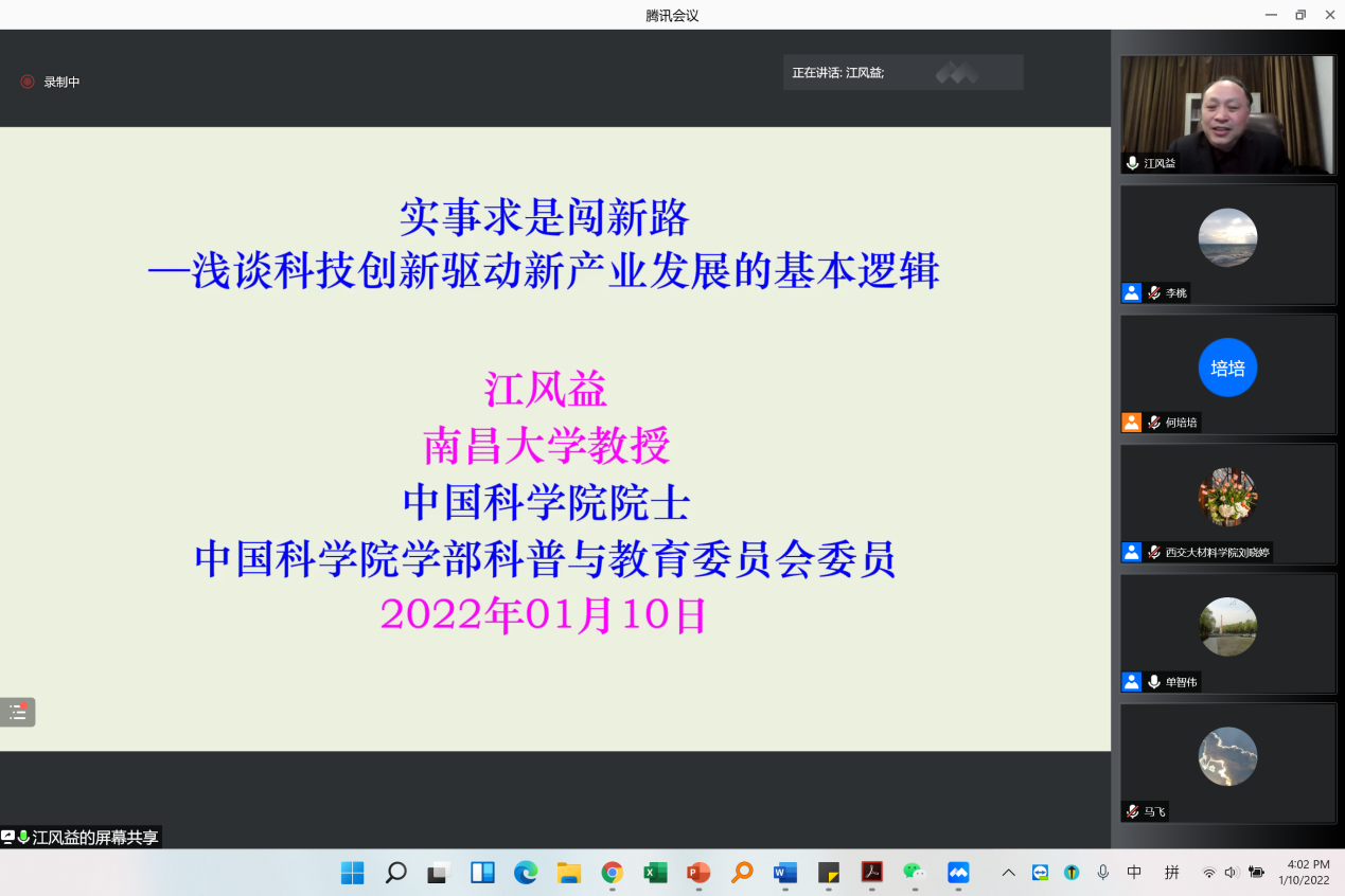 江风益院士做客周惠久论坛线上讲座,以“实事求是闯新路——浅谈科技创新驱动新产业发展的基本逻辑”为题,通过自身多年积累的宝贵创新创业经验,为大家分享如何有效实现创新驱动产业发展。报告受到广泛关注,来自西安交大及其他高校、科研院所的650余名师生在线参加了讲座。本次讲座由单智伟院长主持。