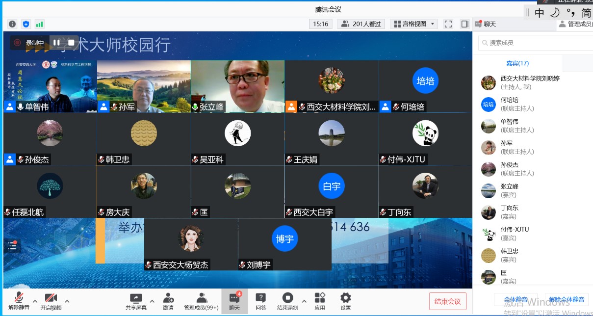 张立峰教授做客周惠久论坛线上讲座,以“钢中非金属夹渣物控制的基础理论与关键技术”为题,系统的介绍了钢中夹杂物的来源、特征、危害及其控制理论与关键技术等。报告受到广泛关注,来自西安交大及其他高校、科研院所等440余名师生在线参加学术报告会。本次讲座由单智伟院长主持。