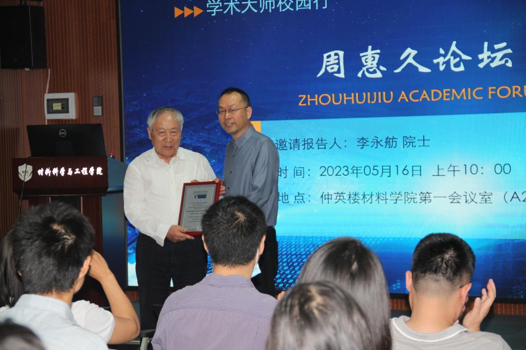 院长单智伟教授为李院士颁发“周惠久论坛终身成就奖”荣誉证书。马伟教授表示希望今后与李院士有更多深入交流的机会,相互促进,共同提高材料研发水平。
