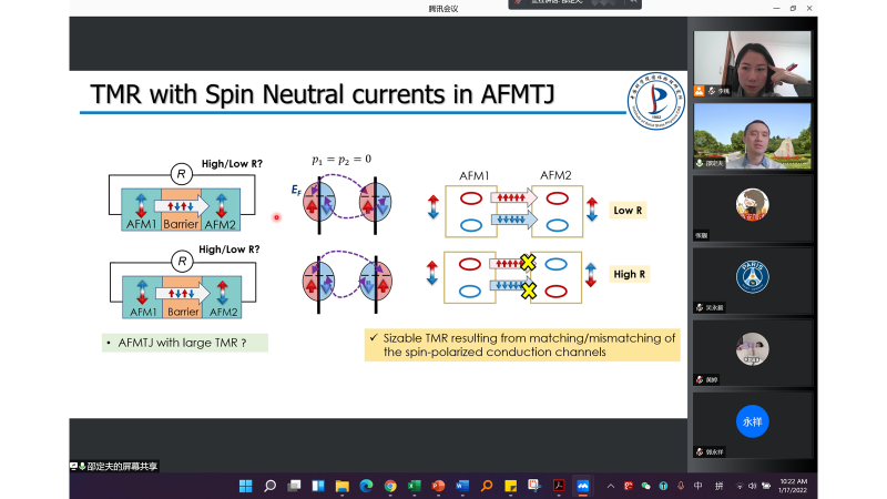 ,在线上进行了题为《Antiferroic tunnel junctions》的学术报告,介绍了铁电、铁磁材料在新一代芯片材料中的应用前景以及在反铁磁/反铁电器件领域的研究成果。本次讲座由李桃教授主持,8X8X