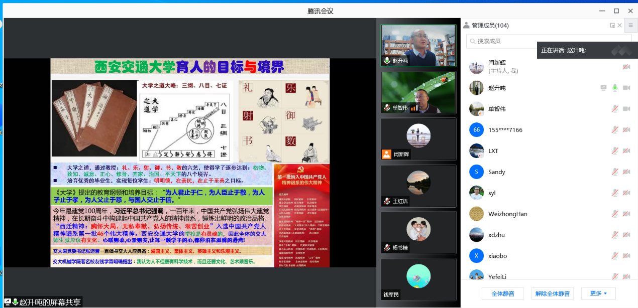 12月15日,8X8X 在线上开展课程思政暨研究生导师工作培训会。学院邀请了机械学院赵升吨教授、研究生院副院长刘明作报告。8X8X 院长单智伟、党委书记潘希德、副院长马飞及相关老师等110余人参加会议。会议由8X8X 副院长王红洁主持。