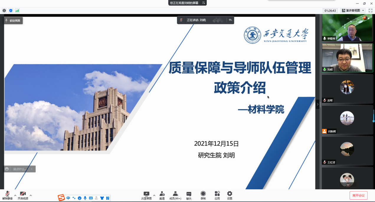 最后,潘希德书记指出导师是研究生培养的第一责任人,负有对研究生进行学科前沿引导、科研方法指导和学术规范教导的责任。希望大家勇于肩负培养国家高层次创新人才的使命与重任,不断加强自身对科学前沿的探索研究,做好坚持学术规范和维护学术道德的典范,并在指导学生过程中始终坚持高标准、严要求、勤沟通,才能充分发挥出全过程、全方位的育人作用。