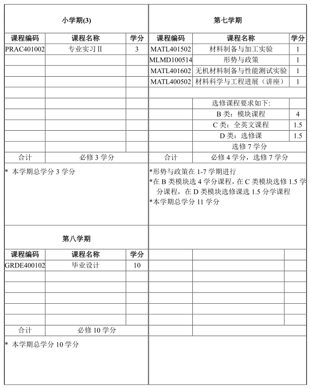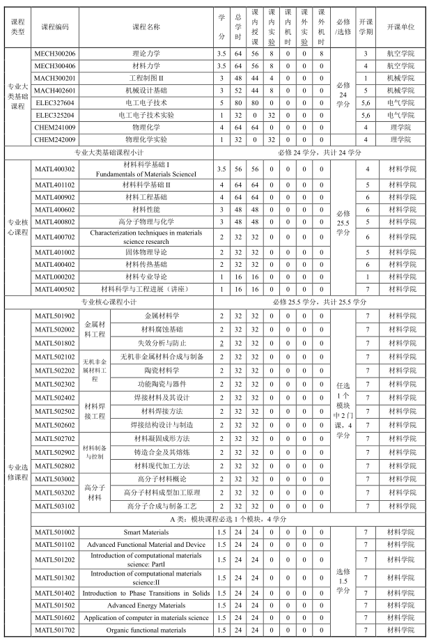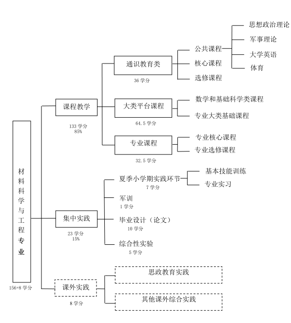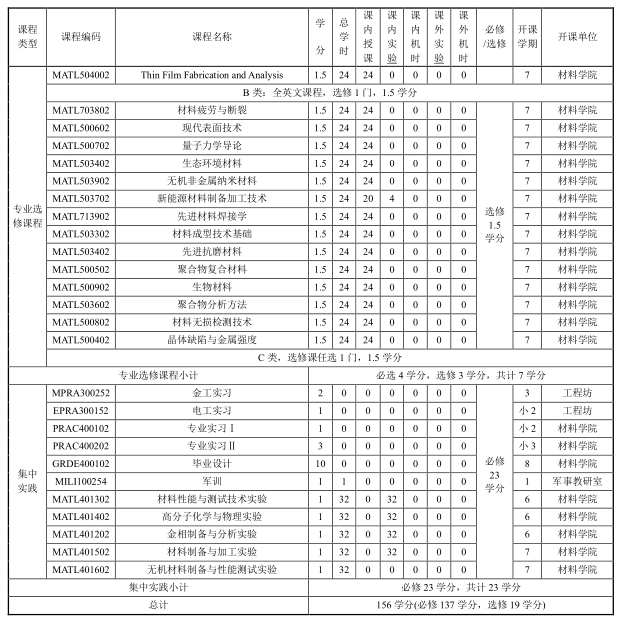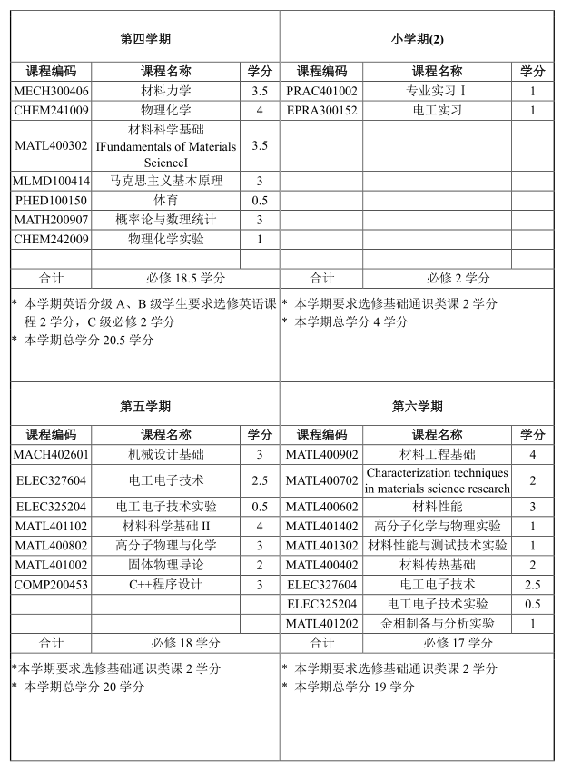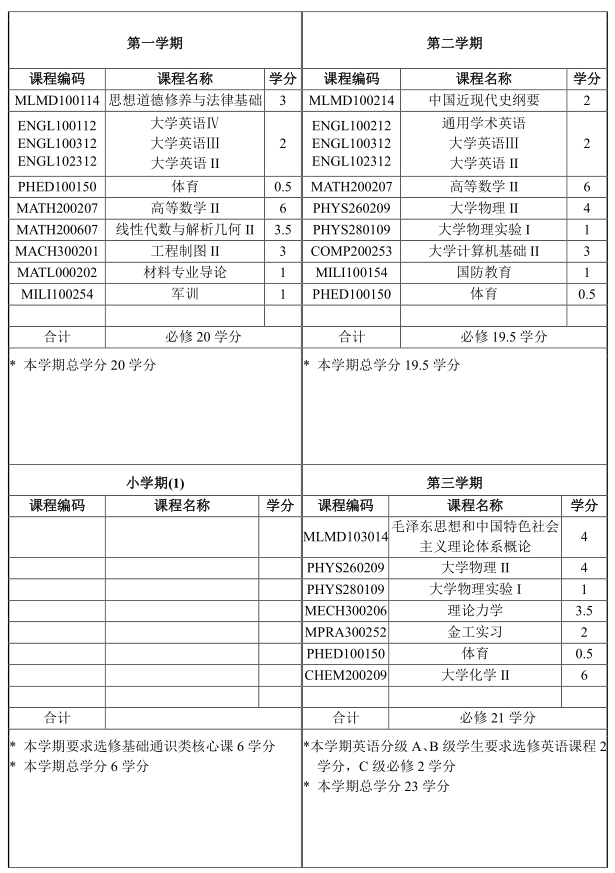 3、专业实习:共4学分,分别在第二学年和第三学年小学期进行,第二学年小学期为分散实习,1学分,第三学年小学期为集中实习,3学分。要求学生进入与材料科学与工程专业相关的厂矿企业实习,按学院要求进行考核。