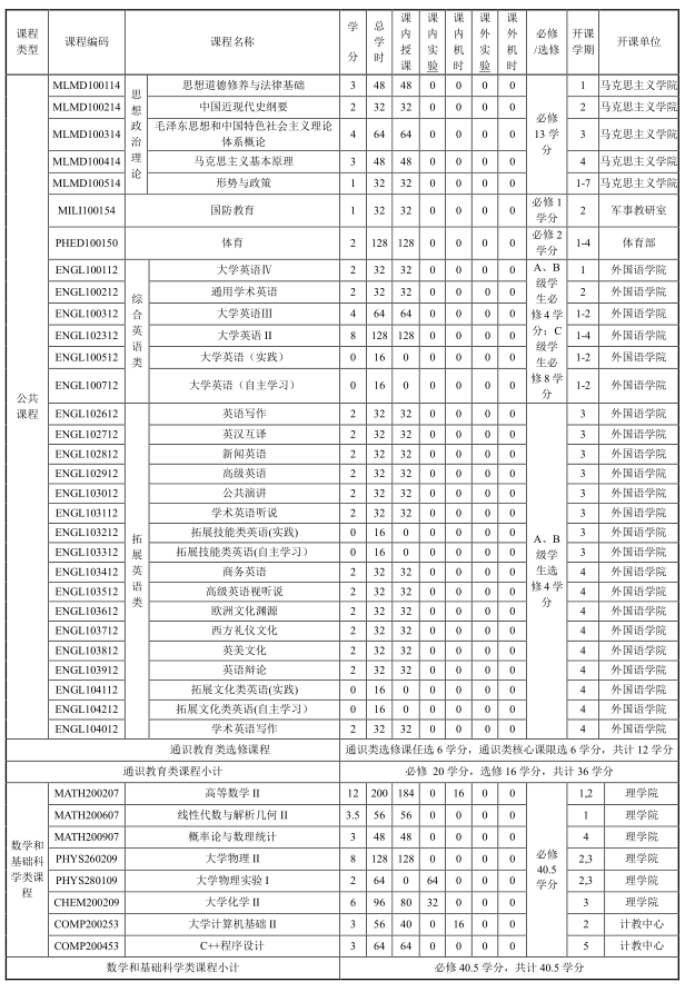 1、通识教育类课程:必修20学分,选修16学分(其中通识教育类选修课任选6学分,通识教育类核心课限选6学分。公共英语课程包括理论课程、实践课程和自主学习三部分,学生需全部选择并完成相关教学要求方可获得相应学分;英语分级为A、B级的学生,第一、二学期必修4学分,第三、四学期选修4学分,英语分级为C级的学生第一至四学期必修8学分;选修英语辩论课程,应先修公共演讲课程。