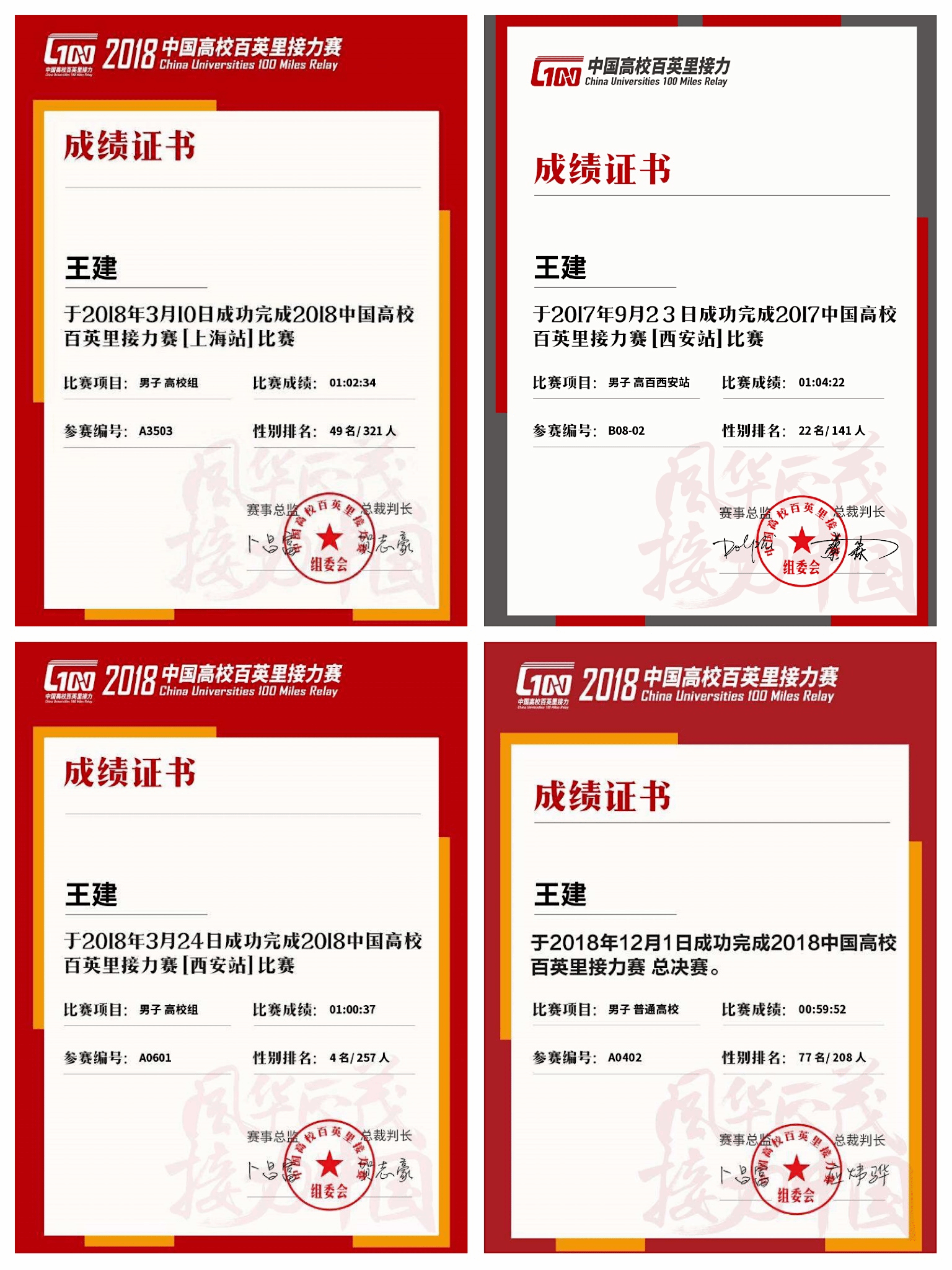 2018年3月,2018中国高校百英里接力,代表学校获高百(上海站)普通高校2018年3月, 2018中国大学生马拉松联赛西安站第三名
