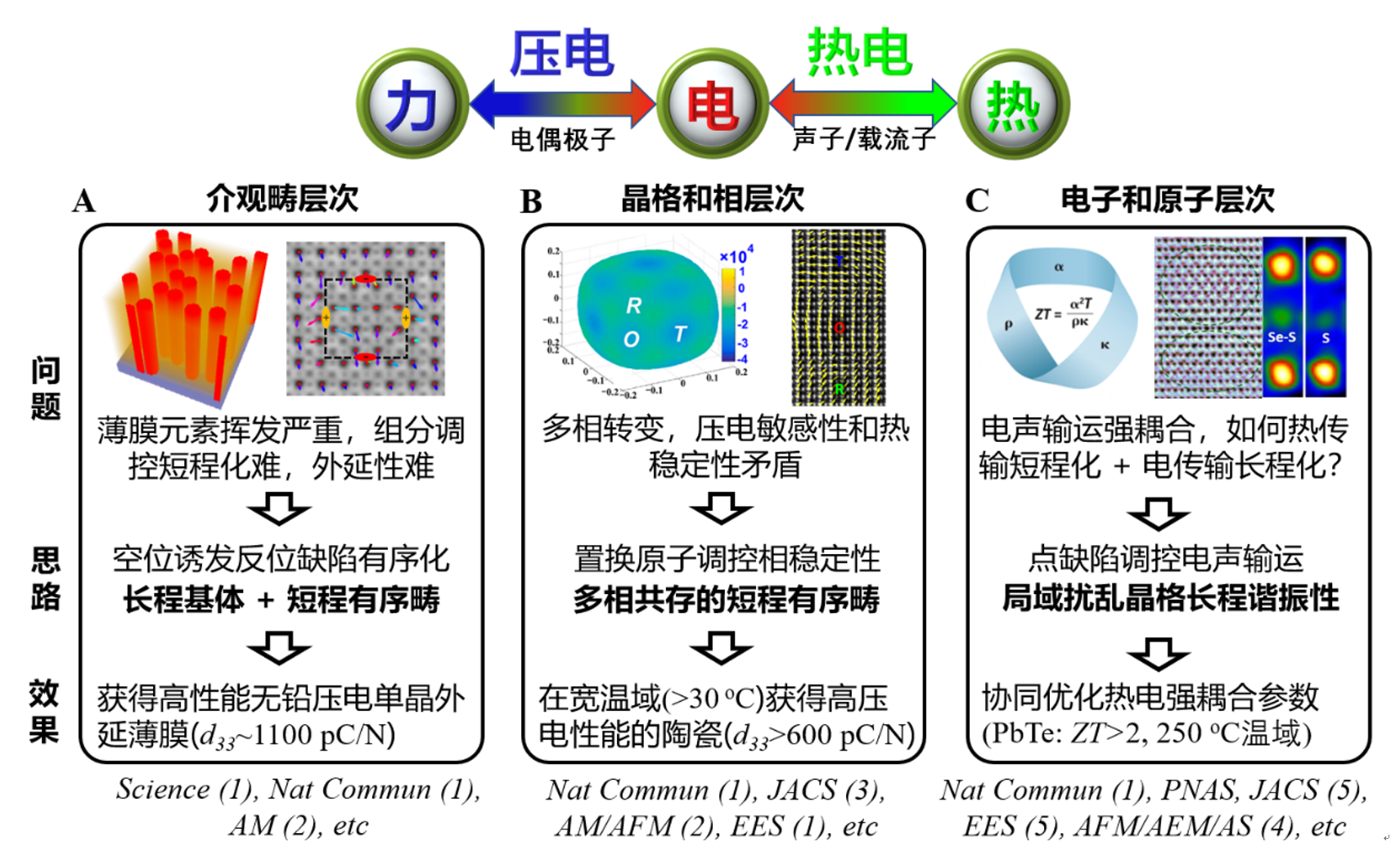 围绕国家对于高效功能材料的战略需求,长期从事可实现力↔电↔热环境感知和能量转换的铁电/压电和热电材料的结构设计、机理分析及性能调控。通过调控点缺陷实现长程序参量的短程化,从而优化铁电/压电和热电材料动态响应,基于此思路开展了如下工作:利用材料的本征空位在长程基体中诱发短程有序的纳米畴,获得的无铅薄膜压电系数是性能最高铅基薄膜的两倍;通过固溶置换原子形成多相共存的短程有序畴,协同提升了无铅压电陶瓷压电系数(>600pC/N)和热稳定性(>30oC温域);利用点缺陷扰乱长程谐振性来散射声子同时调控电子结构,协同优化电声输运,创造了当时平均ZT的最高记录。