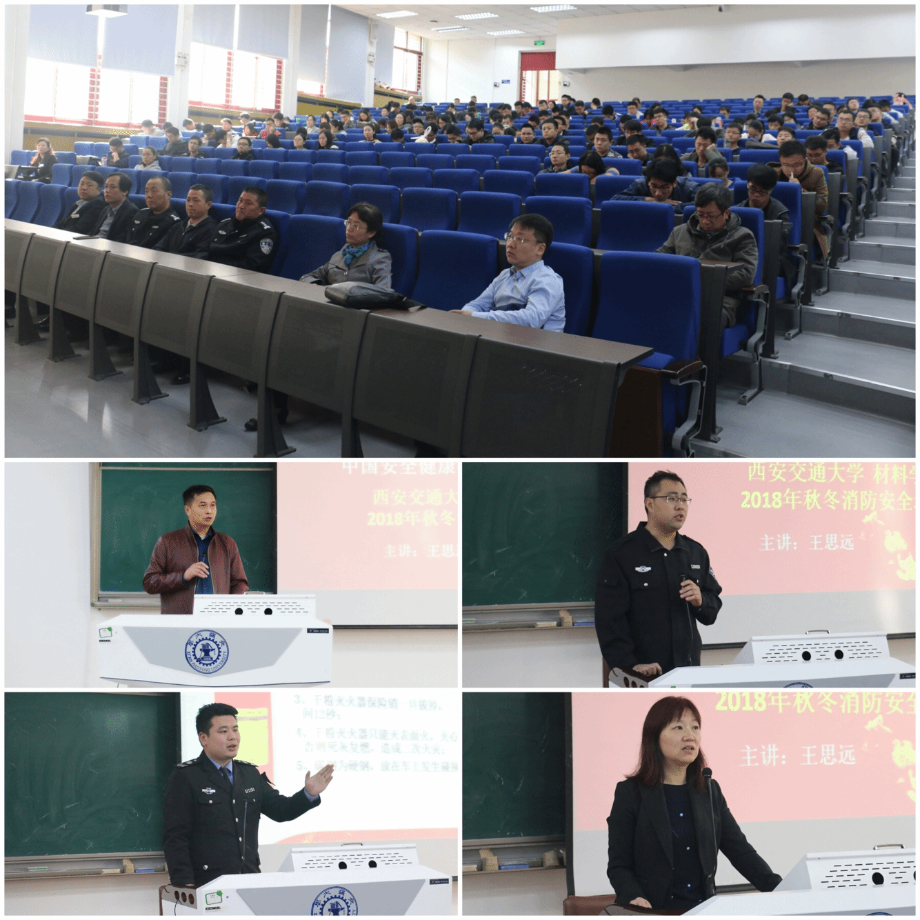 邀请到卫民安消防科技站的王思远教官在1300教室为大家进行秋冬季消防安全培训讲座。西安交大保卫处副处长尤志强、消防科刘豹虎、王红科,实验室与资产管理处李茹,西安交大思源责任公司总经理张志国、总经理助理余庆,8X8X
