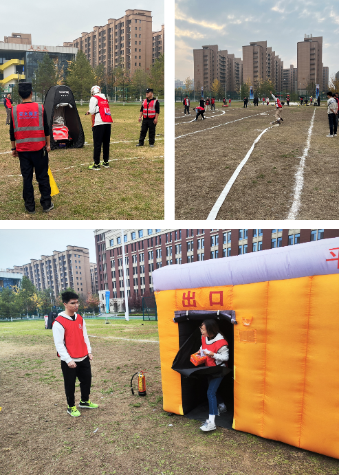 比赛共有四个项目:水带接力、烟雾灭火、障碍救援和危急时刻。在“水带接力”中,潘久斌、林逸鑫、张伟耀和赵辰昊配合默契,迅速连接好水带与枪头、穿戴好消防服并完成“灭火”任务。在“烟雾灭火”中,宋漪琪与周相宏行动迅速,宋漪琪快速通过烟雾逃生帐篷并交接防烟面罩,周相宏佩戴防烟面罩后扑灭火源。在“障碍救援”中,赵闻达、吴诗丽齐心协力,穿过重重障碍救出“火场被困人员”。在“危急时刻”中,杨旭东、张芸霄、张振宇迅速通过布满障碍的赛道将水桶装满,取得了小组第3名的优秀成绩。