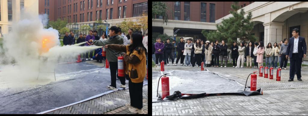培训结束后,赵军荣老师与刘豹虎老师带领同学们前往3号巨构西侧空地开展消防器材灭火演练活动,消防人员有序组织同学们正确使用灭火器进行灭火。