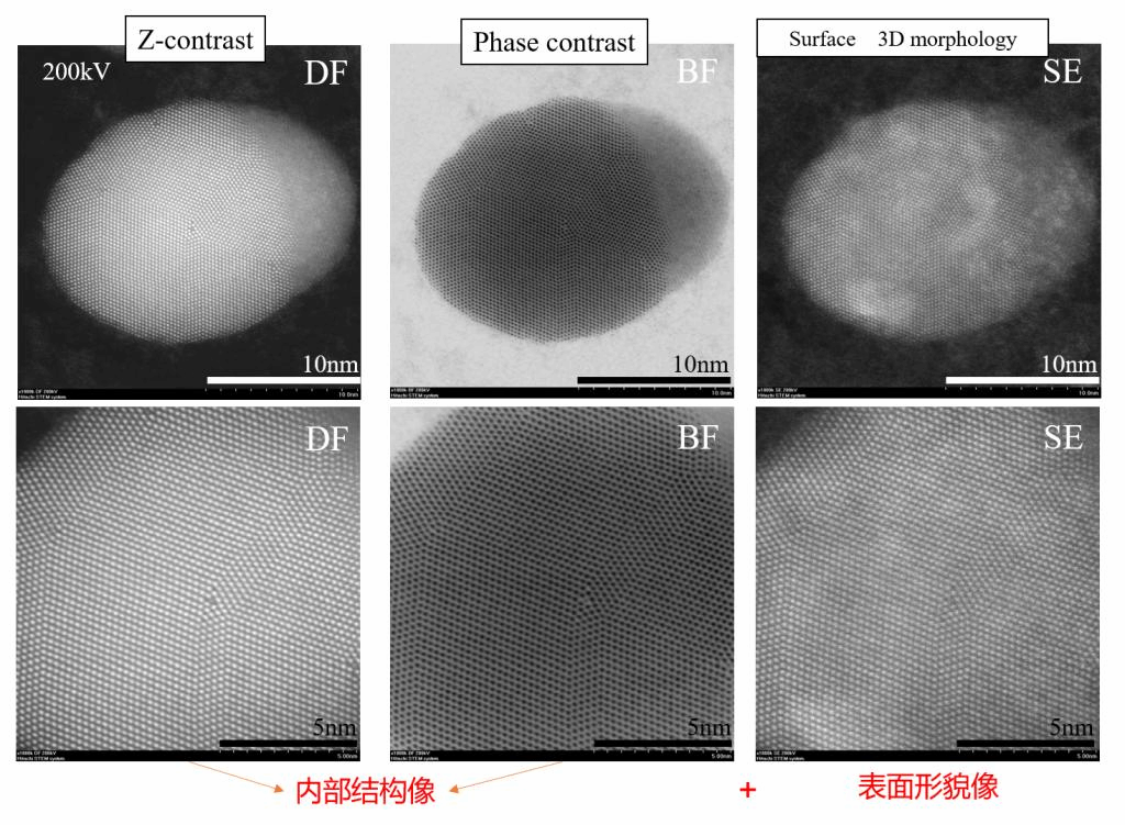 日立HF5000环境球差透射电镜配备冷场电子枪和自动球差校正器,可实现自动球差校正,最高分辨率可以达到0.078nm;配置二次电子探头、双能谱探头和电子能量损失谱,可实现透射和扫描同时成像,即同时观察材料内部和表面形貌信息;可在原子尺度上确定样品的元素成分和化学特性(EDS及EELS测试);可进行多种气体环境下(氢气,甲烷,氧气,氮气,一氧化碳,二氧化碳),从室温至1100℃的原位表征。